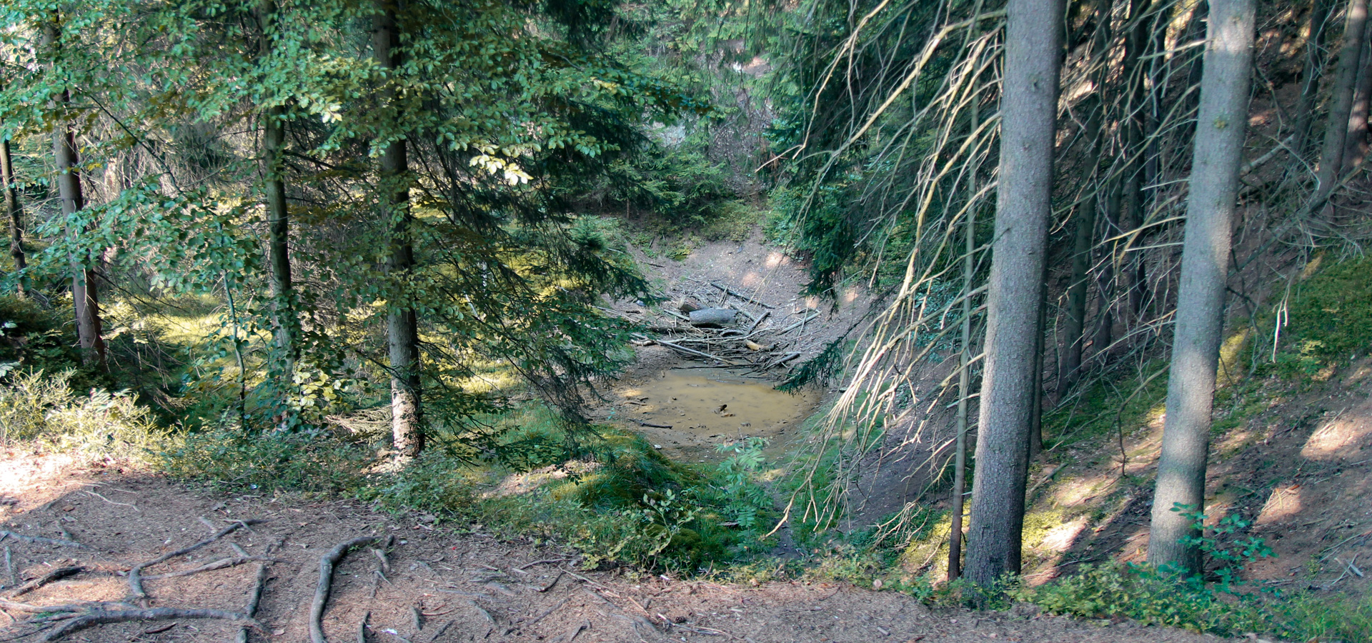 Dalej, po krótkiej wędrówce przez las, kolejne jeziorko, a nad nim niewielka polana z kilkoma ławkami. Ostatni fragment trasy jest najdłuższy i prowadzi do jeziorka zielonego - w pewnym momencie schodzimy ze szlaku i patrzymy w dół. Tu kończymy zwiedzanie.