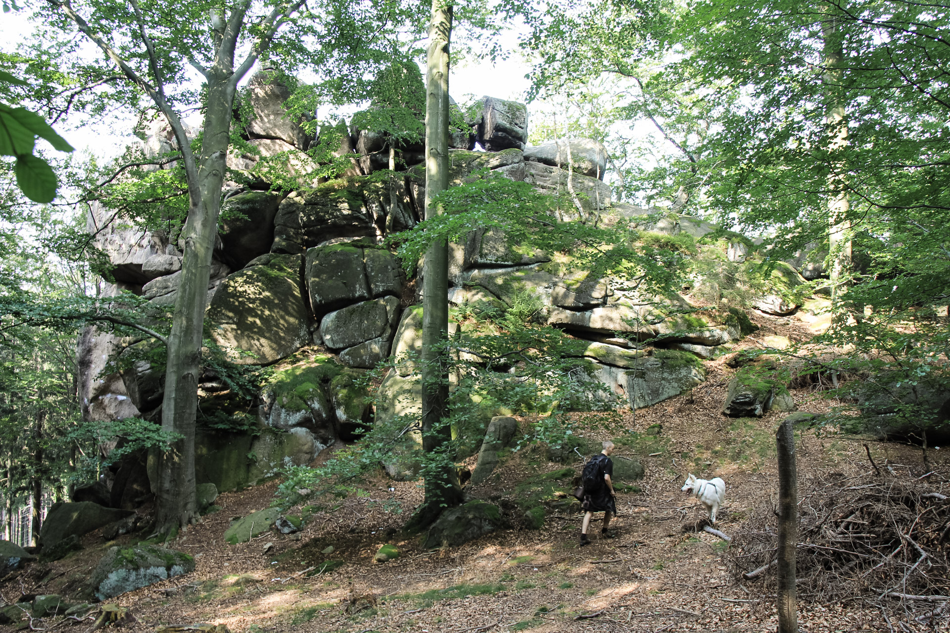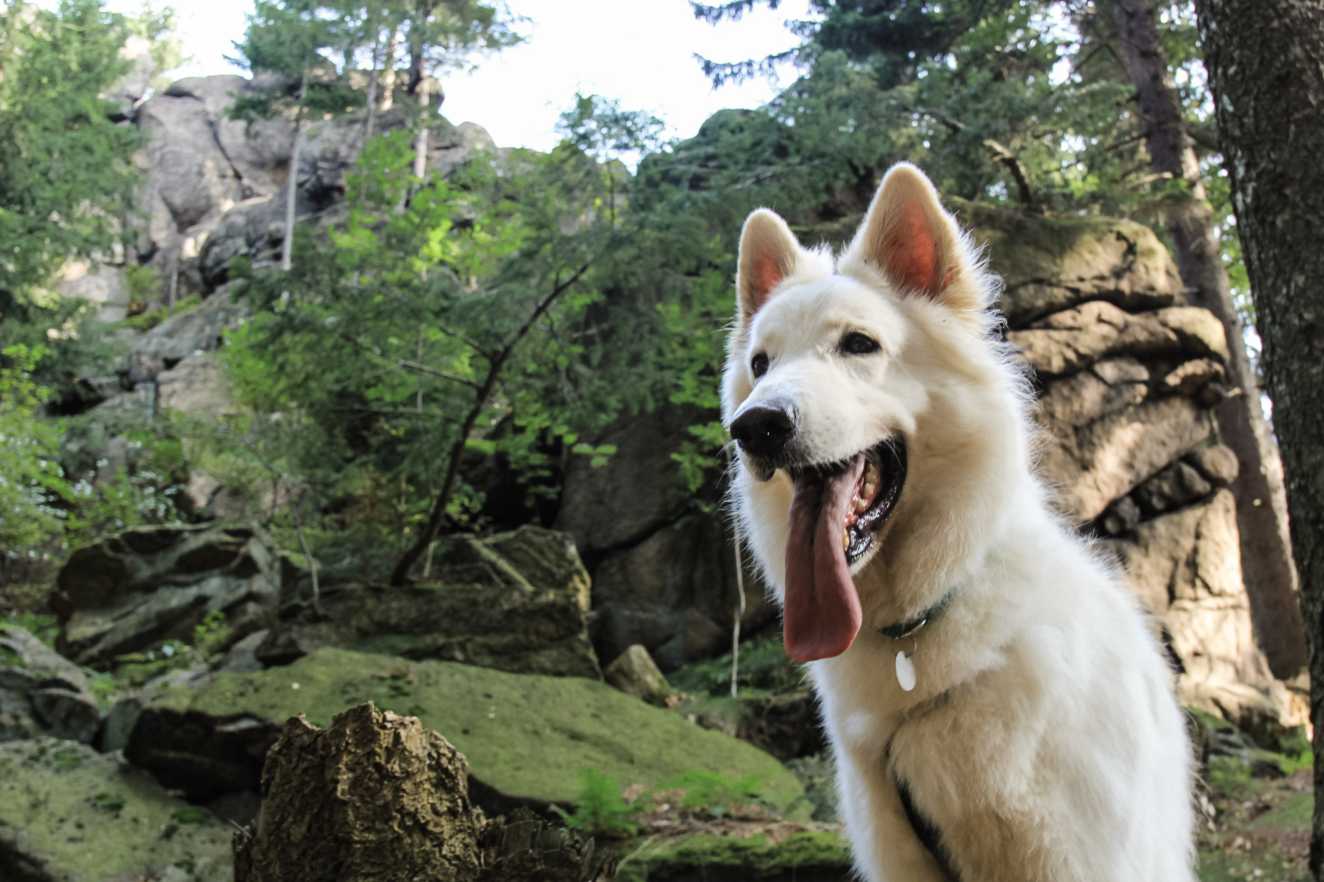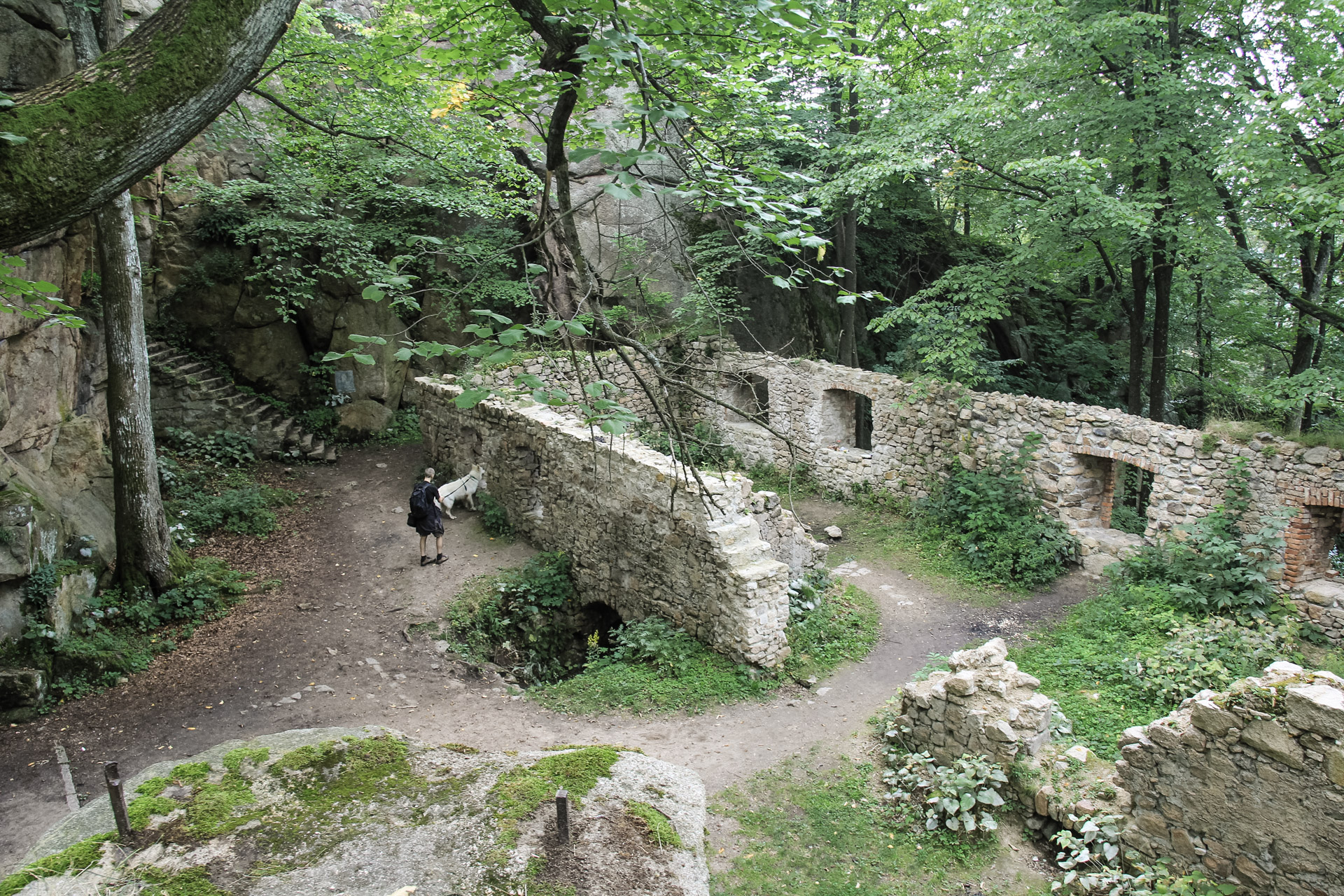 Już spod samego zamku dostrzeżemy skalne grupy znajdujące się zaledwie kilkadziesiąt metrów dalej. Skałek jest tu całkiem sporo, o różnych wielkościach i kształtach. Polecamy zrobić sobie mały spacer po okolicy (np. wzdłuż czarnego szlaku) i pooglądać granitowe ostańce. Dla psa będzie to zapewne świetne uzupełnienie całej eskapady.
