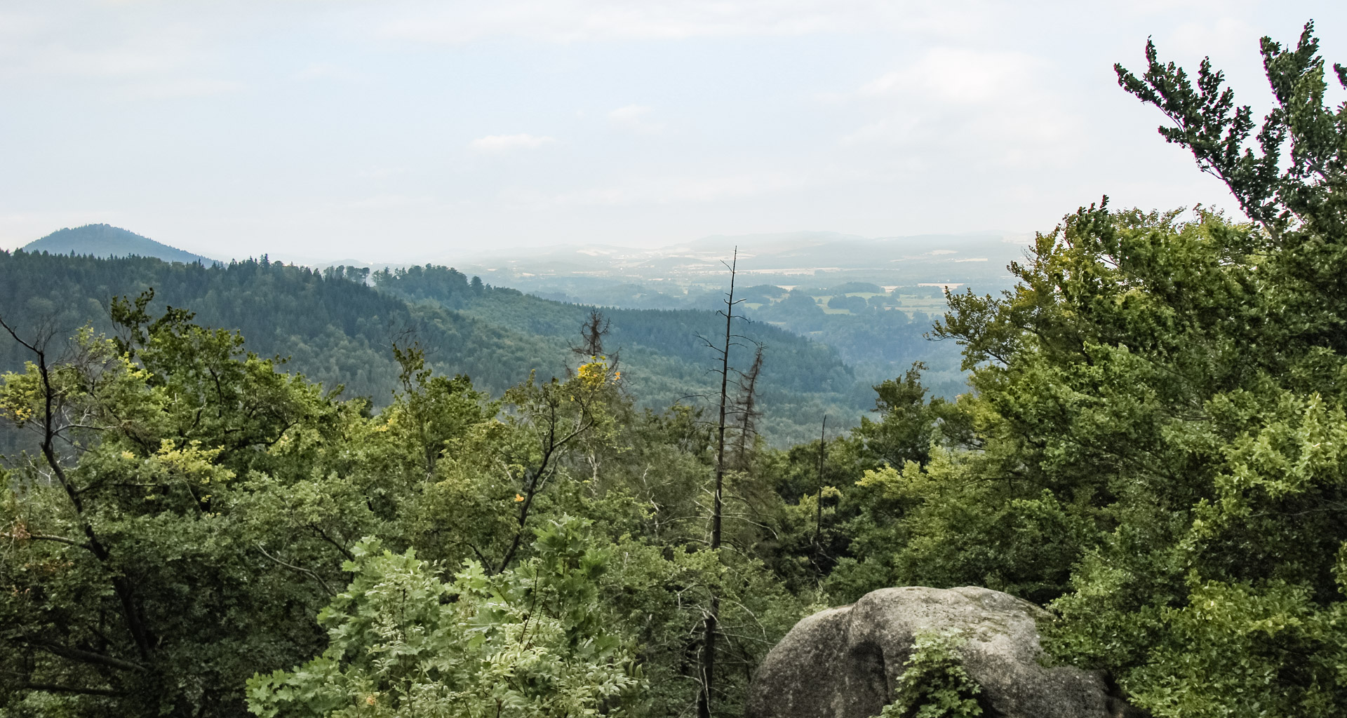 Punkt widokowy, co naturalne, wybija się ponad korony drzew. Widać stąd trochę okolicznych gór i skałek. Ten wysoki czubek po lewej stronie zdjęcia to Sokoliki, które pies Heban odwiedził jakiś czas temu.