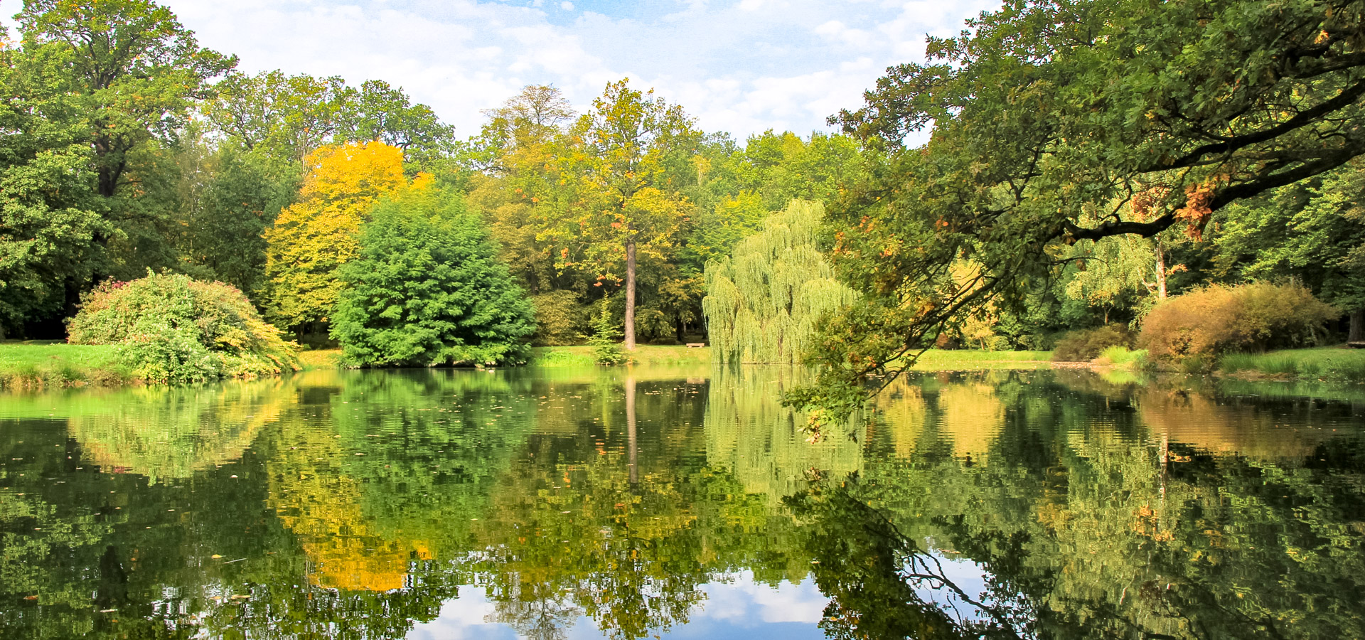 Zostawiamy pałac za plecami, by przyjrzeć się tej najbardziej wymuskanej części parku, urządzonej w stylu angielskim. Znajdziemy tu zielone, krótko przycięte trawniki oraz krzewy i drzewa nasadzone w nieprzypadkowy sposób, co widać zwłaszcza na jesień, gdy ich liście przyjmują zupełnie inne kolory, tworząc wielobarwny krajobraz (szczególnie dobrze zaobserwować można to nad stawem, który zamyka tę część parku).