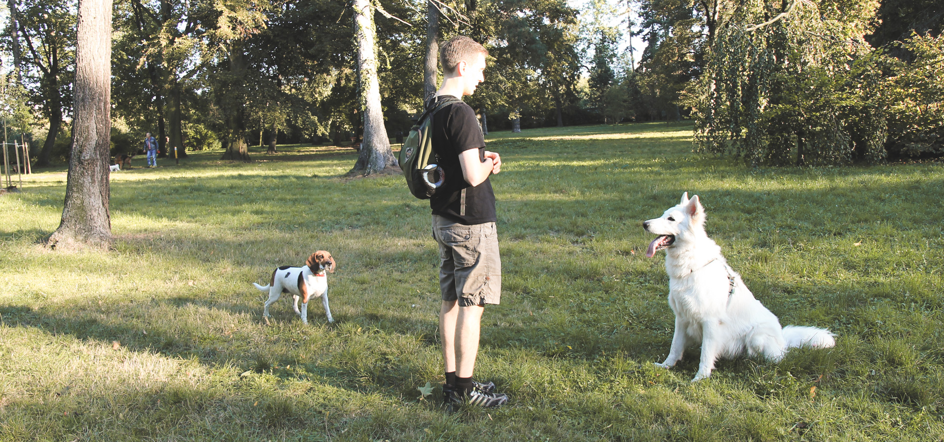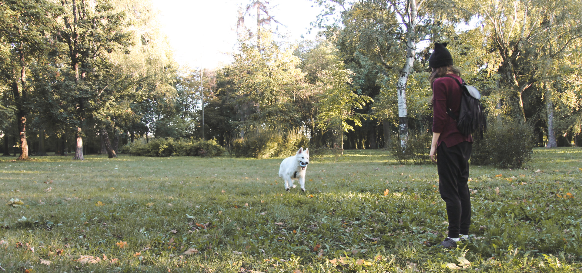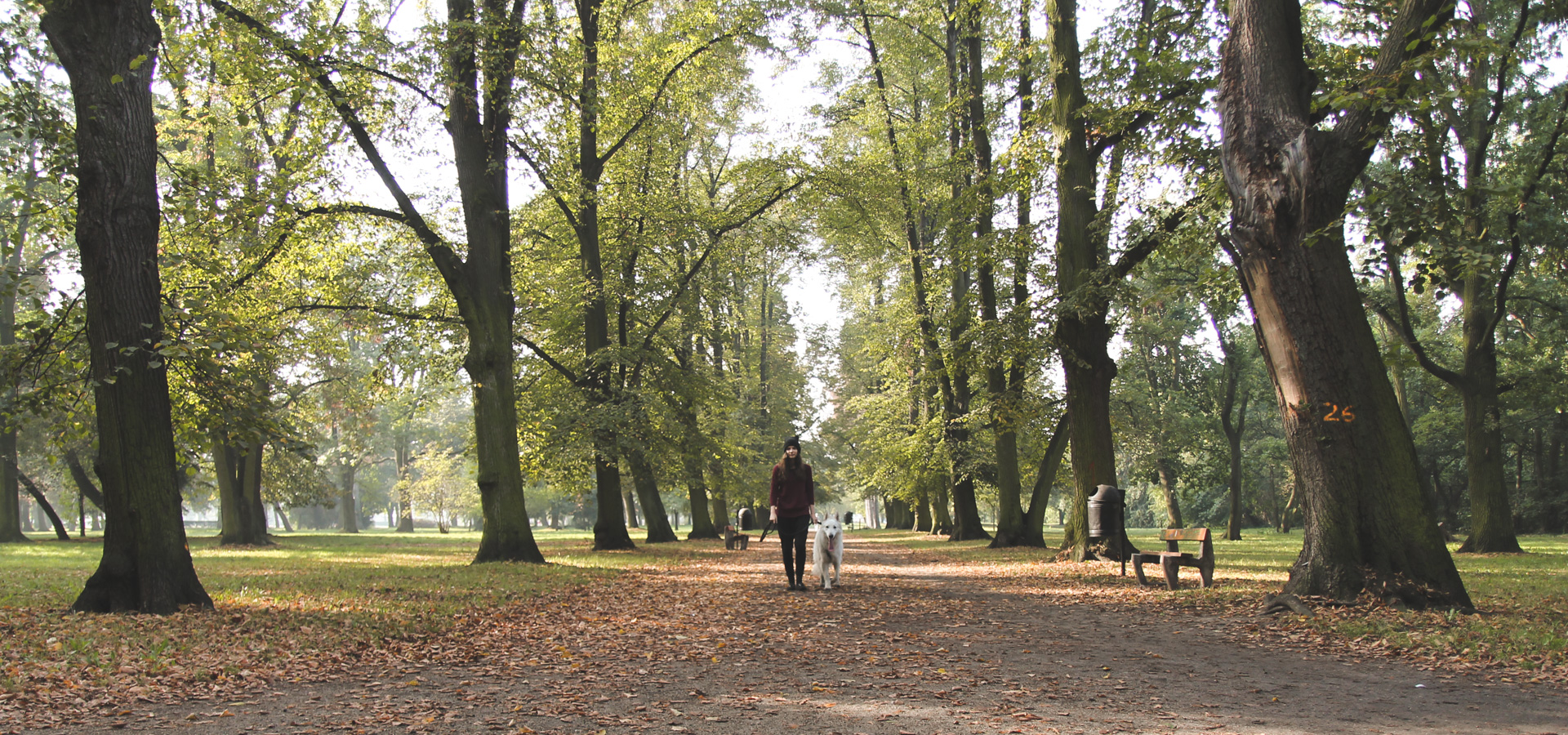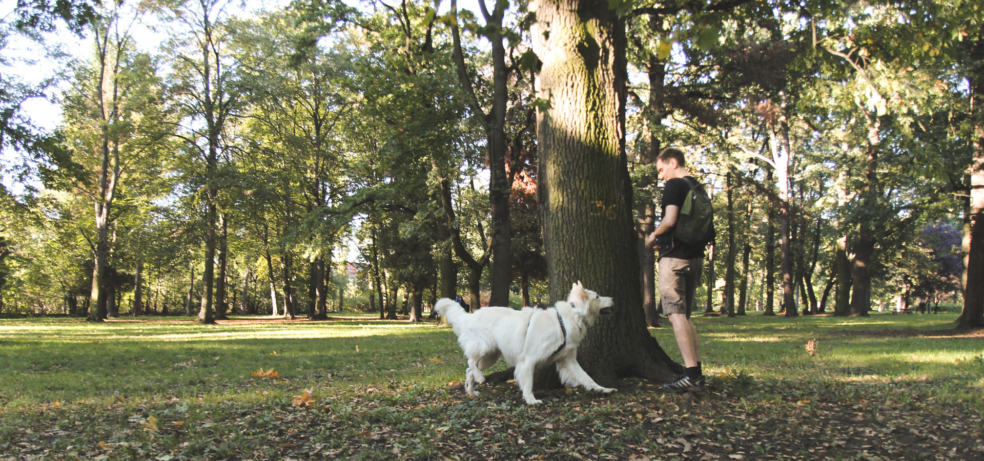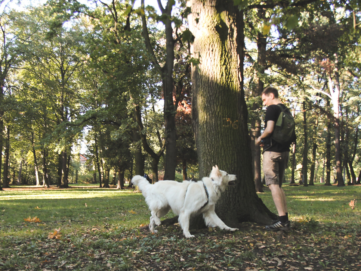W Parku Skowronim jest dużo drzew o grubych pniach, które aż proszą się, aby się za nimi schować psu, gdy ten nie patrzy, bo na przykład odbiegł od nas kawałek. Jeśli jesteśmy sami, czekamy aż pies sam podejmie akcję poszukiwawczą (oczywiście kontrolując jego poczynania). We dwie osoby jest łatwiej - jedna kryje się za drzewem, a druga wydaje polecenie (w tej wersji pies może być na lince/smyczy).