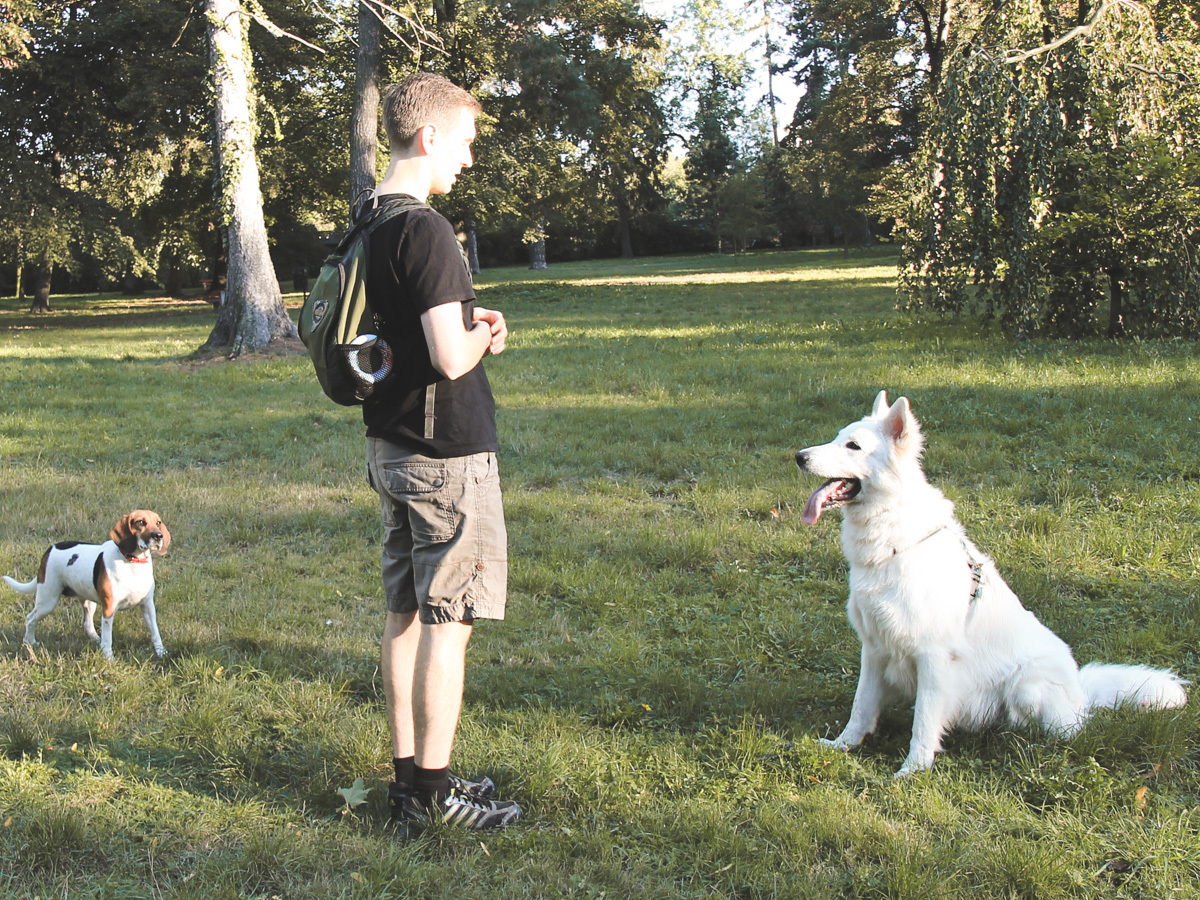 Widząc trenującą grupę owczarków staroniemieckich postanowiliśmy urządzić podobne ćwiczenia z Hebanem. Skupienie Hebana w otoczeniu innych psów do łatwych nie należy, zwłaszcza, że do treningu przyłączył się też inny psiak. Nam się udało, a niespodziewany gość pewnie myślał, że coś mu skapnie. :P
