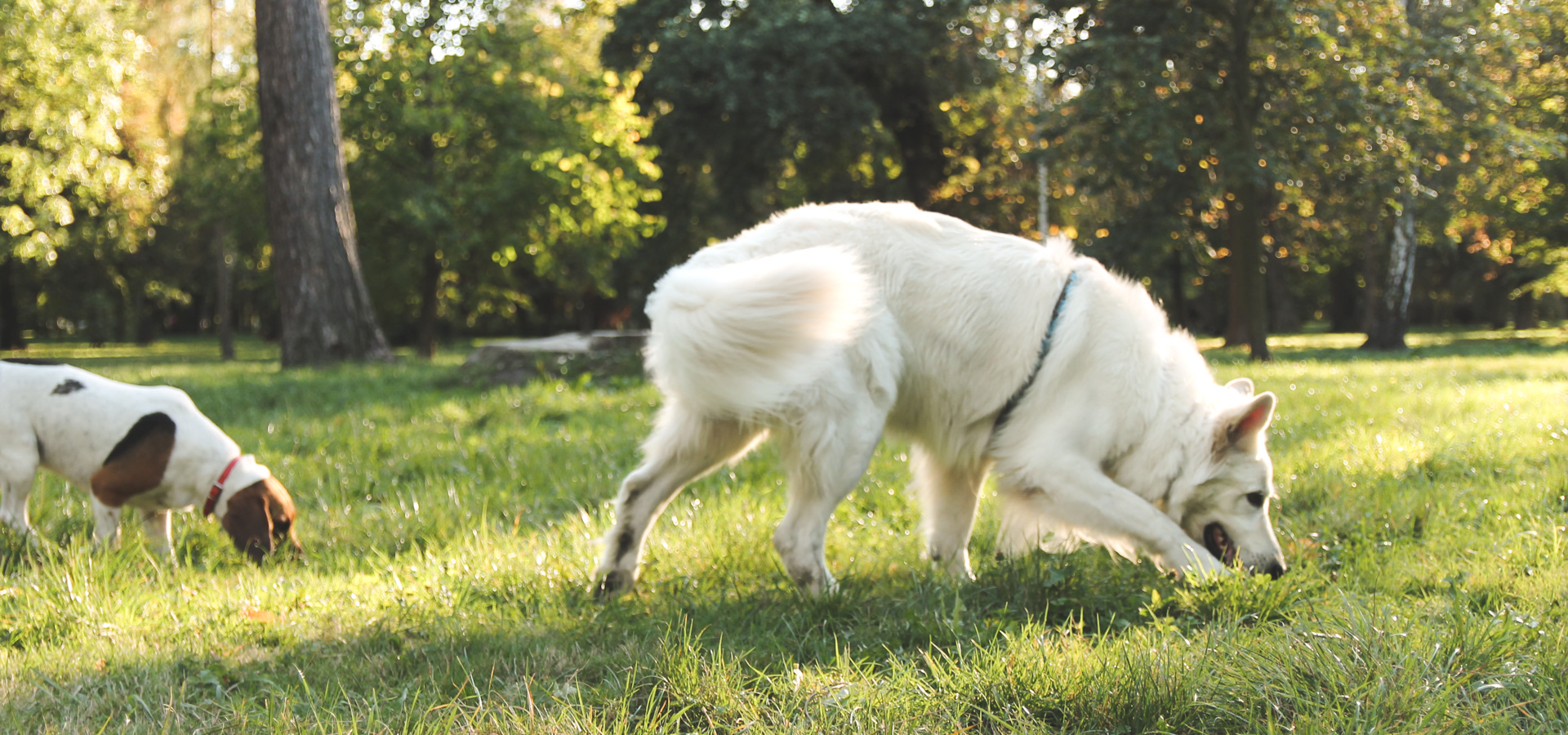 Heban uwielbia węszyć! Wystarczy 5-10 minut. Po intensywnych zabawach rozsypaliśmy więc Białemu kilka smaczków w trawie, żeby się trochę wyciszył i wyluzował. Jak widać na zdjęciu nie tylko Heban postanowił zatopić nos w zielonym dywanie.