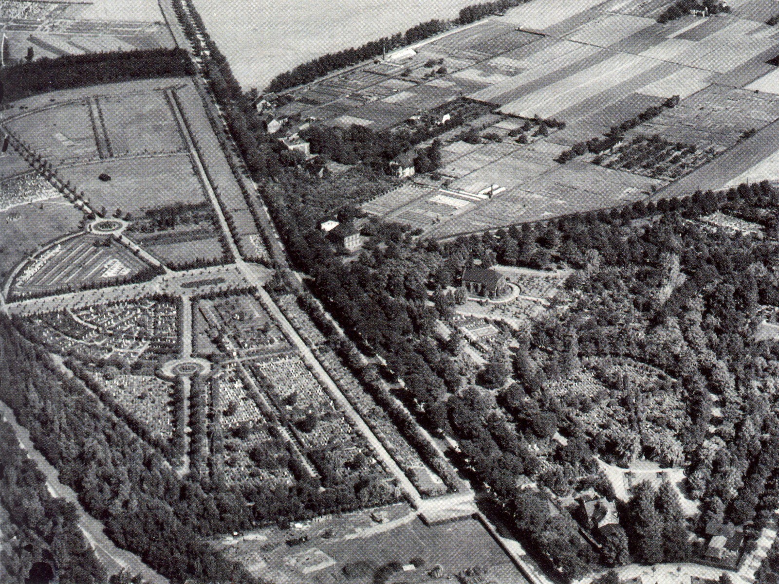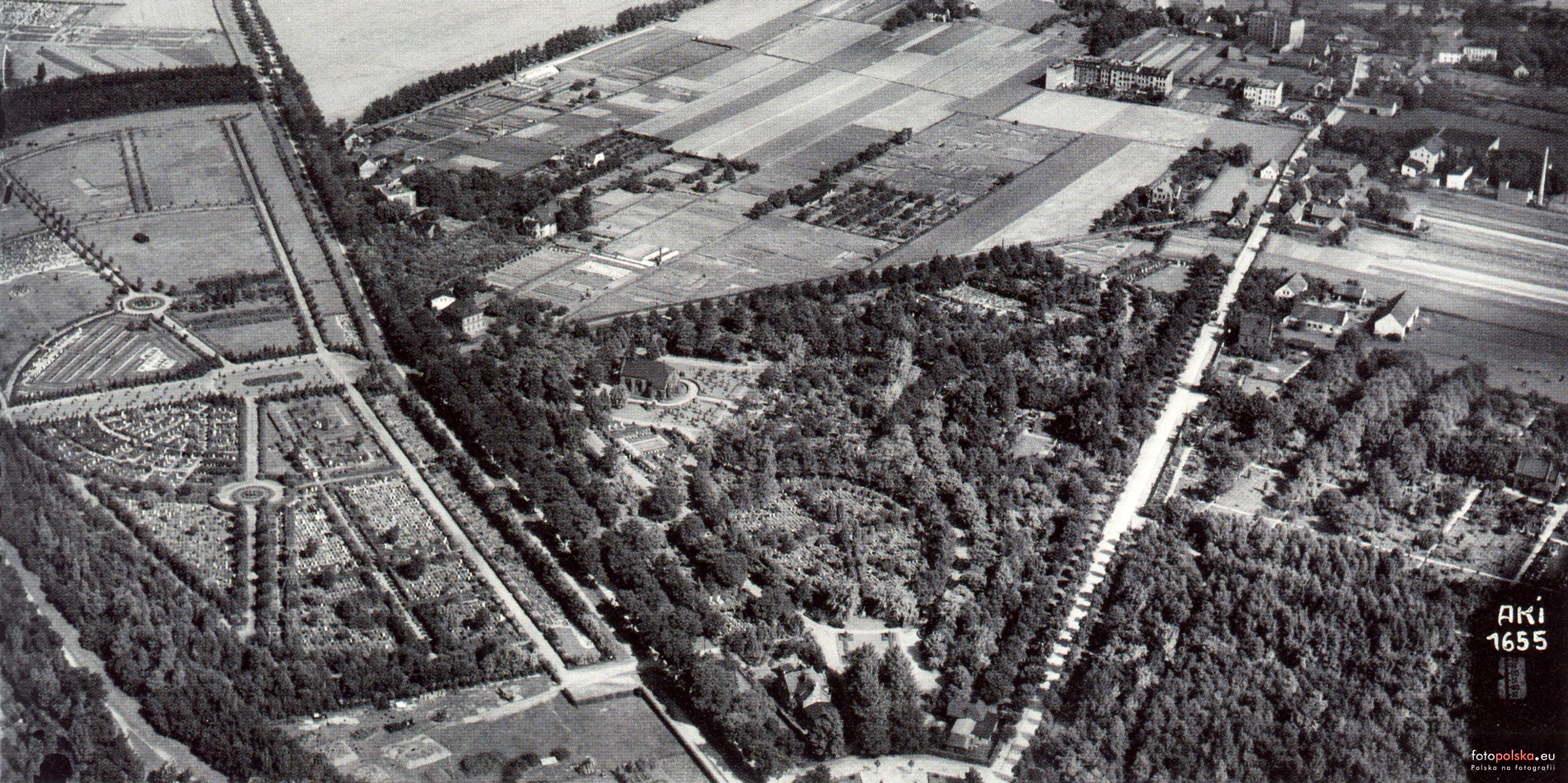 Zdjęcie wykonano ok. 1930 roku. Co ciekawe, już pierwotnie całości przyświecała idea połączenia terenów parkowych ze starymi i nowymi cmentarzami, co ostatecznie udało się zrealizować (stąd tak duża ilość drzew). Ciekawe jak takie koncepcje odbierali współcześni ludzie i jakie odczucia towarzyszyły im podczas spacerów po tak skonstruowanej przestrzeni?