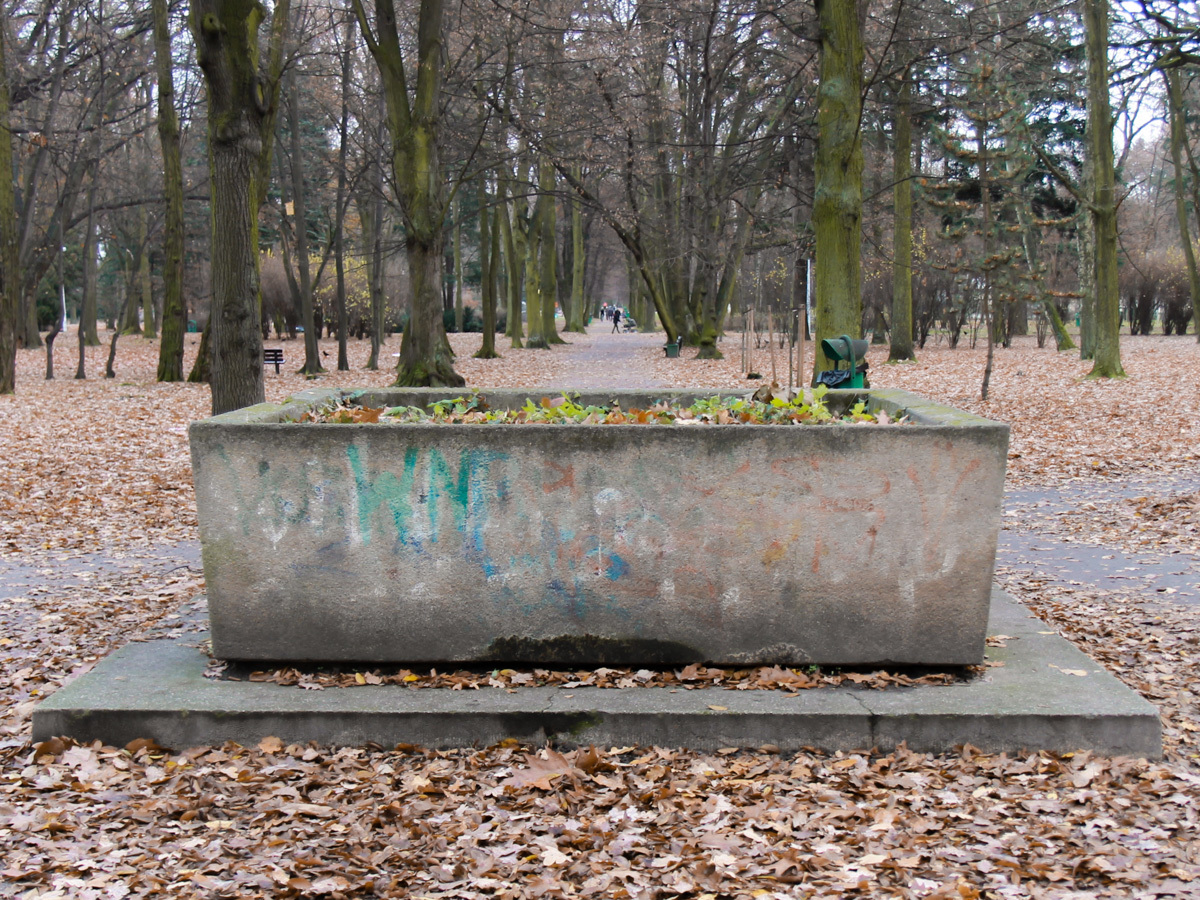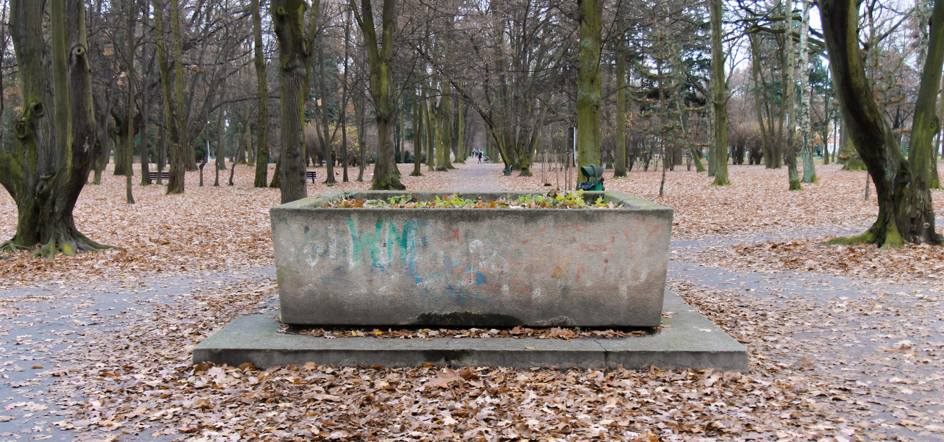 Kamienne odłamki, układ alejek, a przede wszystkim betonowy obiekt stojący na skrzyżowaniu dwóch parkowych duktów to kolejne znaki mówiące do nas z i o przeszłości.