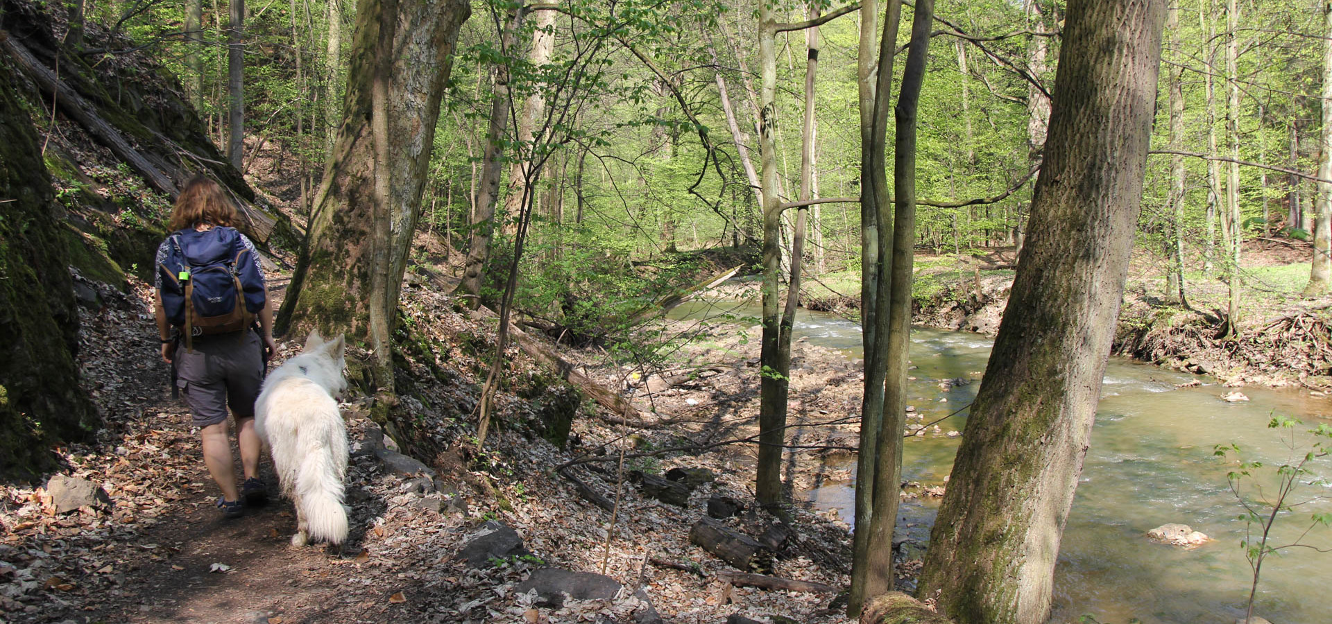 Dalsza droga wiedzie dnem wąwozu. Przyjemny szum rzeki, ścieżka biegnąca tuż nad jej brzegiem i wiosenny las dają odetchnąć od zgiełku miasta i czerpać ogromną przyjemność z wędrówki z psem.