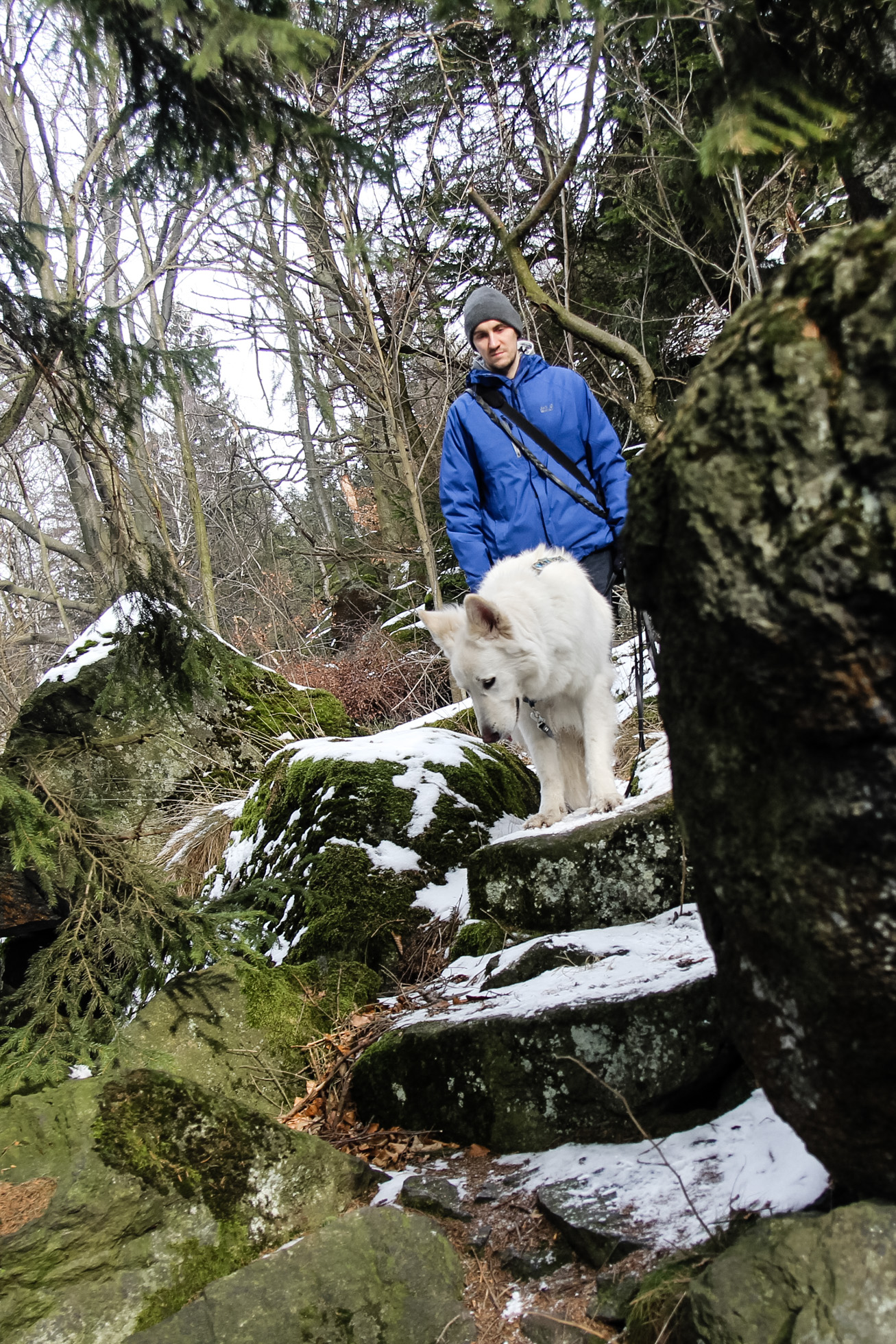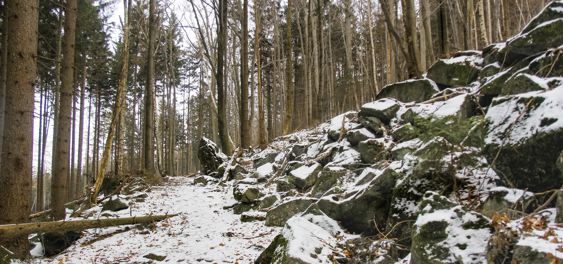 Oprócz zimowego lasu i druidzkich klimatów, ścieżka przyciągnie nas rumowiskami głazów oraz dużym nagromadzeniem skał w swojej drugiej części. Na wysokości Koliby i Skalnej Perci droga już nie będzie monotonna i płaska, o nie! Z resztą zaraz zobaczycie sami. :)