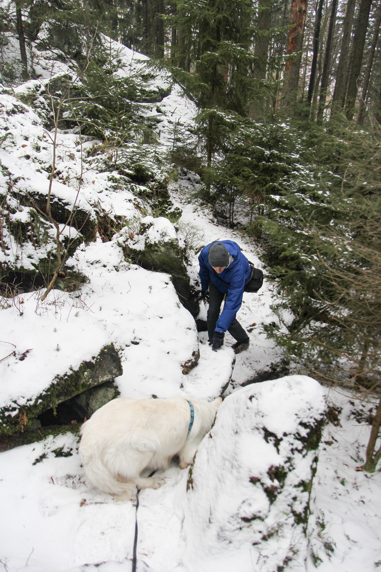 Kolejny ciężki moment - zejście po poprzetykanych dziurami korzeniach. Tu już białego trzeba było lekko podnieść na szelkach (nieocenione w takich sytuacjach), bo pokonanie śliskiego drewna, nawet ze smaczkową zachętą, było dla niego za trudne. Odnotujmy też, że innej drogi nie było.