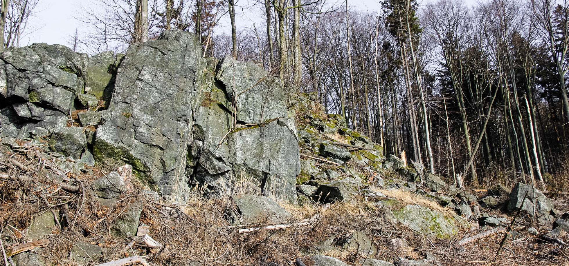 Schodzimy ze szlaku, przechodzimy przez parę krzaków i już po kiludziesięciu metrach znajdujemy się w zupełnie innej przestrzeni. Ślęża wita nas tu tym, co ma najlepsze: skałami w różnej postaci. W zasadzie dzieje się tu mnóstwo rzeczy: wszędobylskie, porozrzucane chaotycznie, pojedyncze kamienie, formujące się gdzieniegdzie w większe grupy, gdzieś dalej przebijające się zza wysokich drzew duże masywy skalne, no i leżące wszędzie połamane gałęzie, przecinające nie raz drogę naszego marszu...