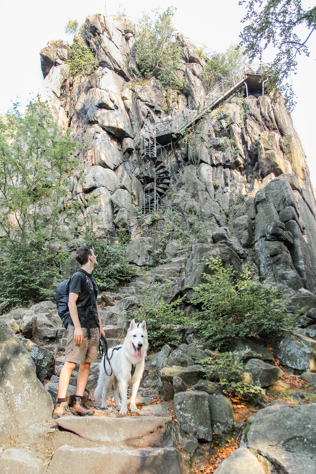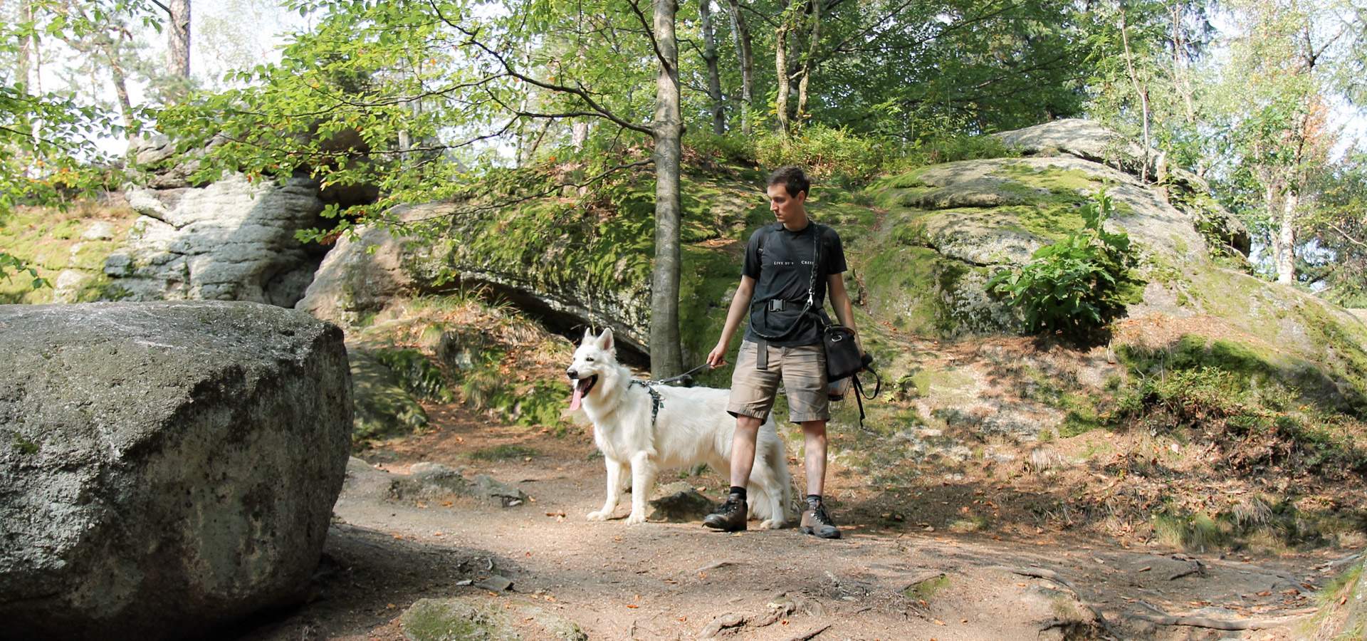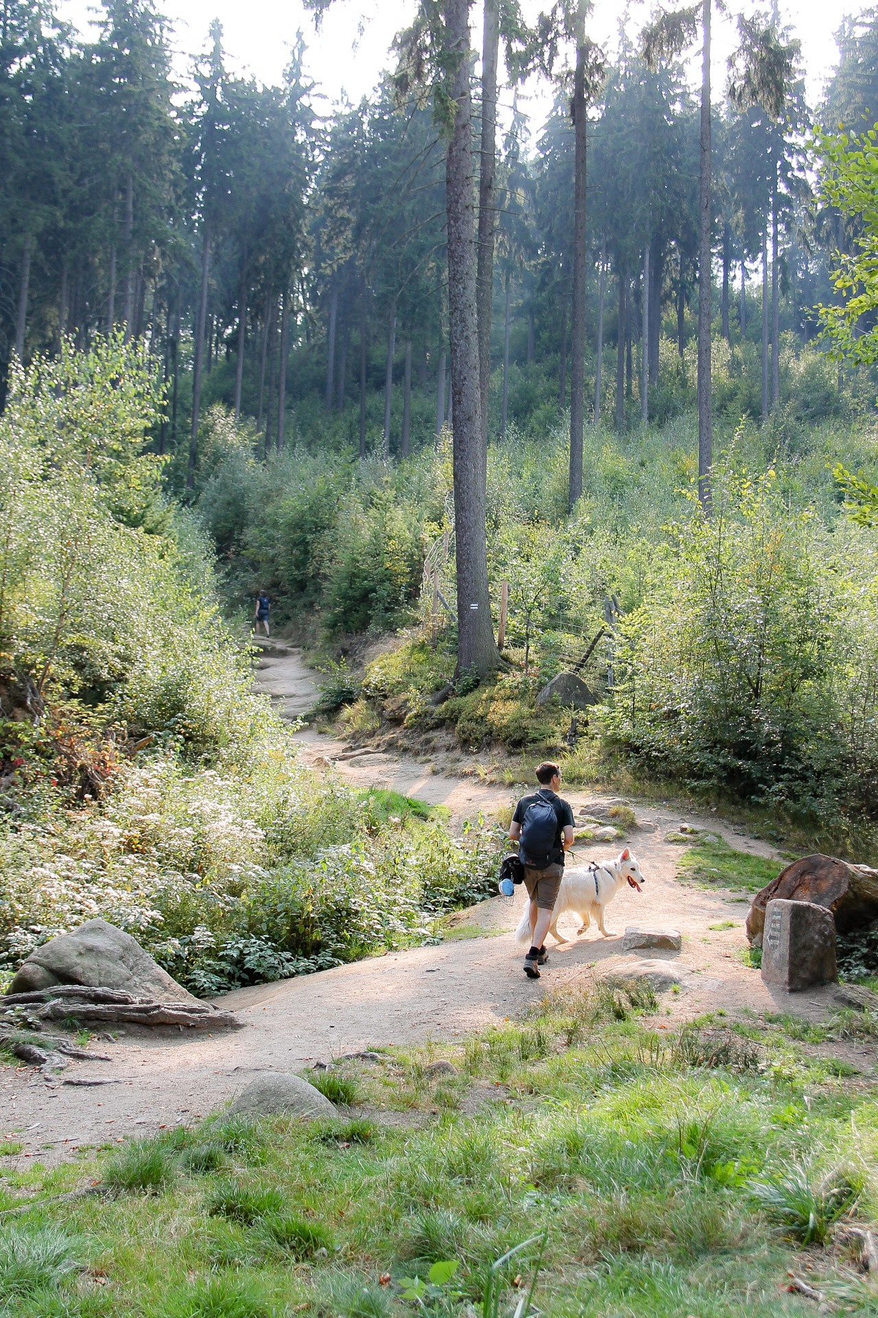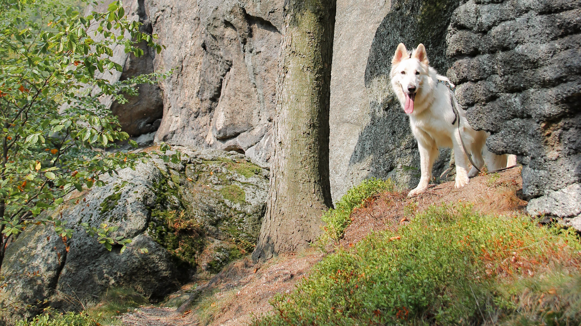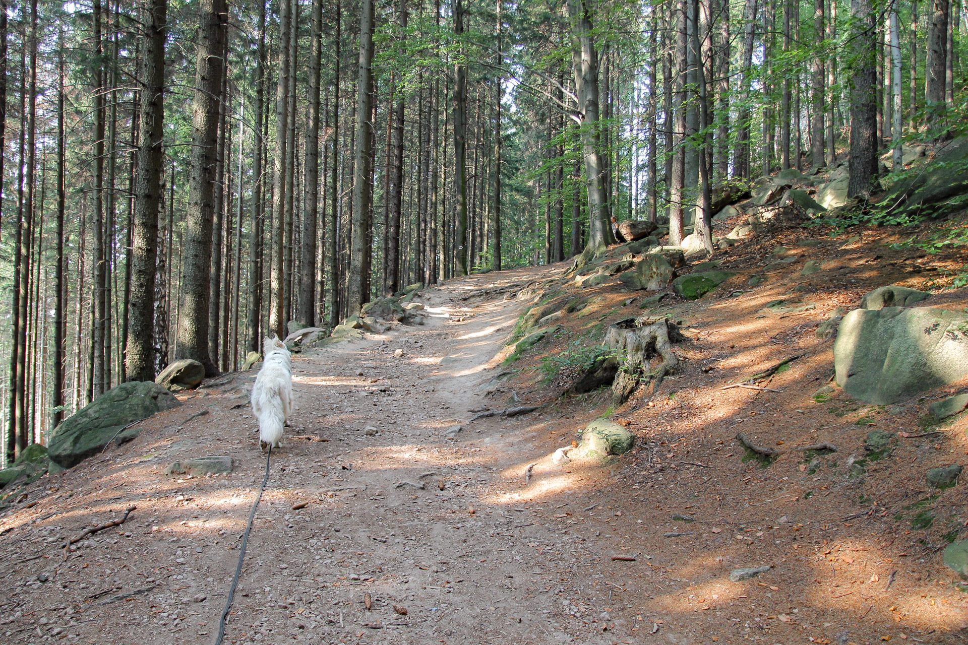 Ze Szwajcarki ruszamy dalej istną mieszaniną szlaków. Trasa nie jest już tak wygodna: tu kamień, tam głaz, ogólnie jest wąsko, bardzo nierówno i dosyć trudno dla mniejszych dzieci i wózków, które spotykamy po drodze. Do szczęścia brakuje jeszcze tylko psa. A nie, zaraz... jest i on!