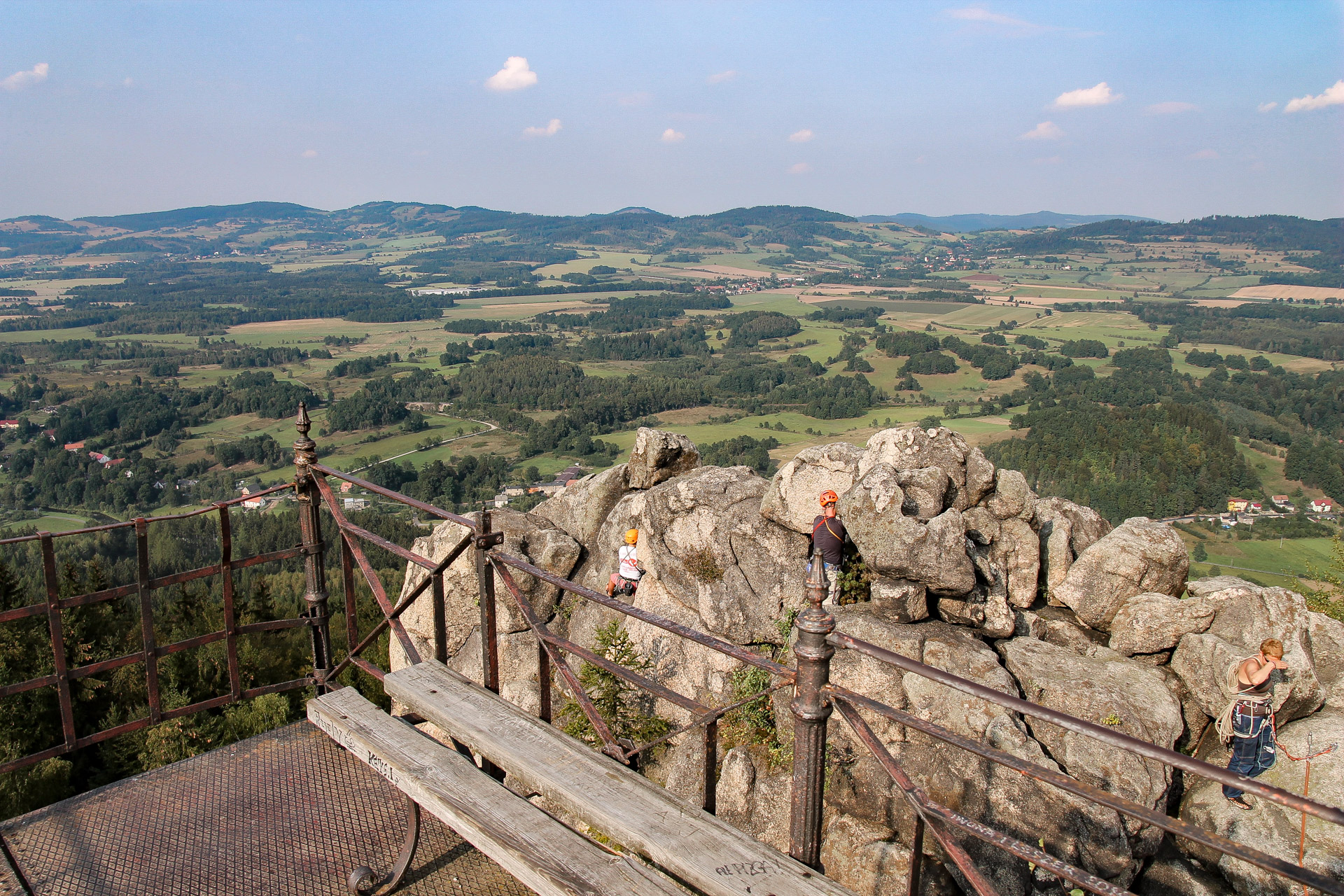 No i wdrapaliśmy się. Na szczycie czekają na nas: platforma widokowa (z barierkami), charakterystyczny 7 metrowy krzyż i widoki na Kotlinę Jeleniogórską, Rudawy Janowickie, Góry Izerskie, Kaczawskie i Karkonosze. A daleko, daleko za górami można wypatrywać czubka Śnieżki. :)