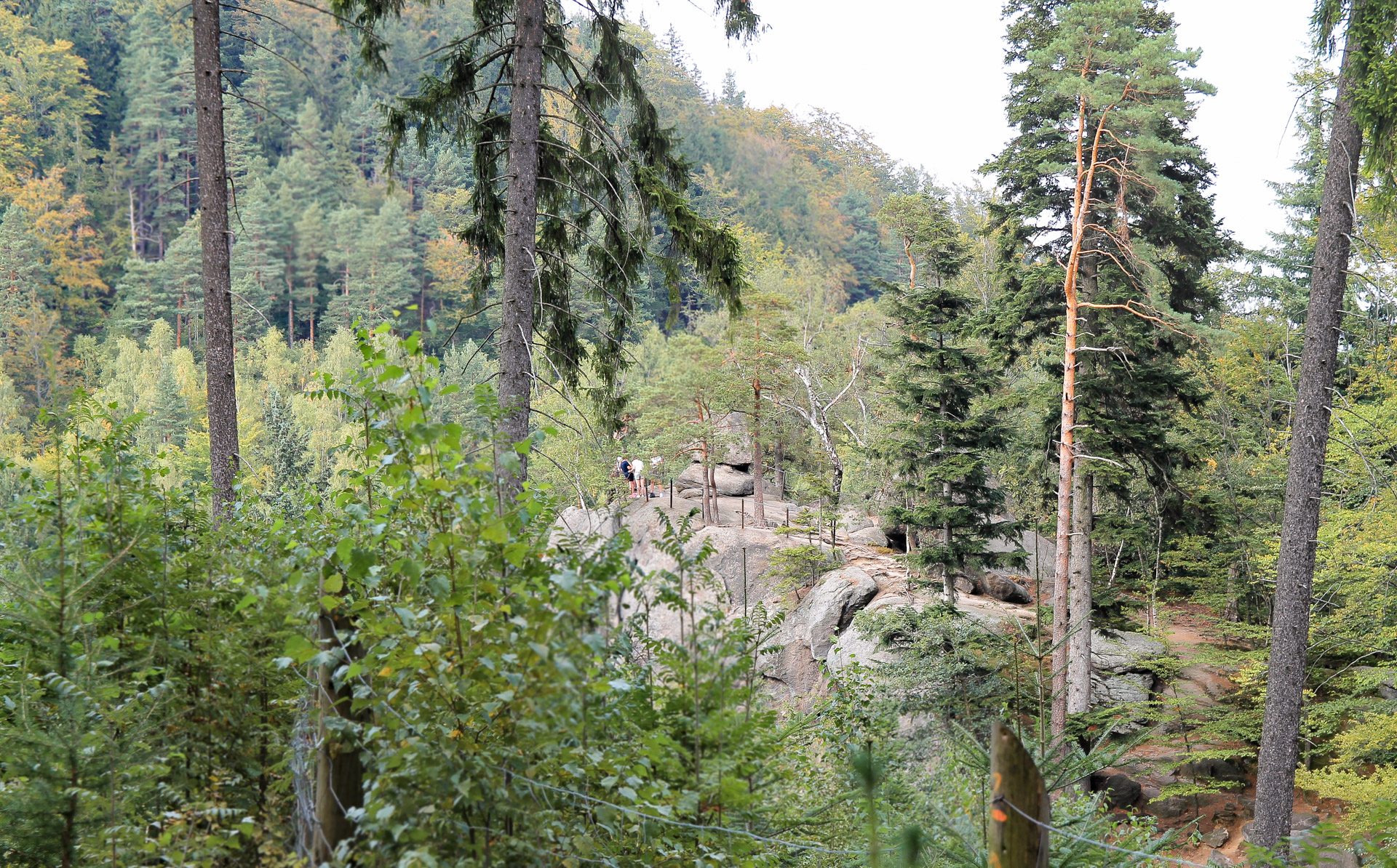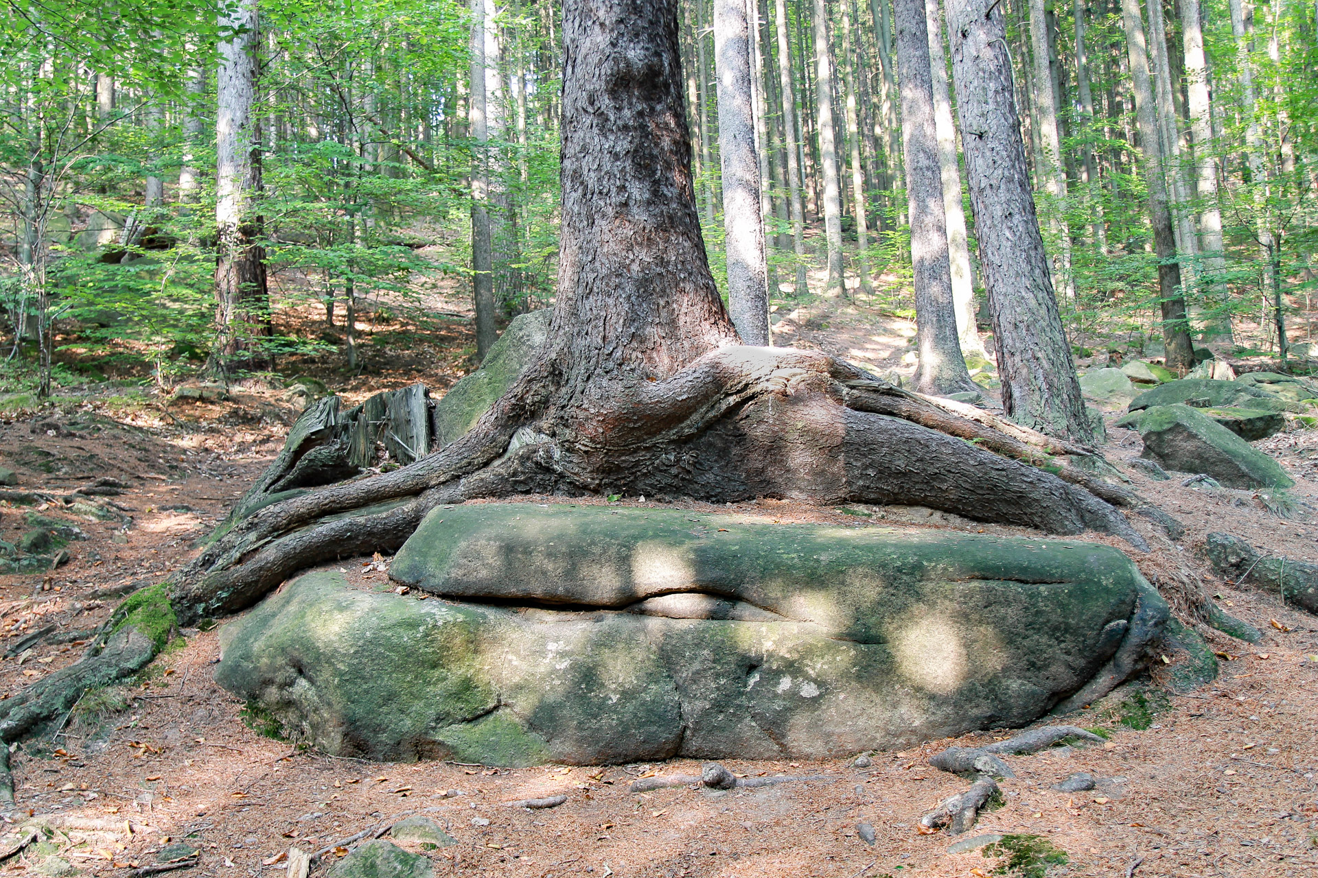 Jesteśmy tuż przed celem naszej wyprawy. Im wyżej wchodzimy tym częściej przez drzewa przebijają się większe partie skałek.
