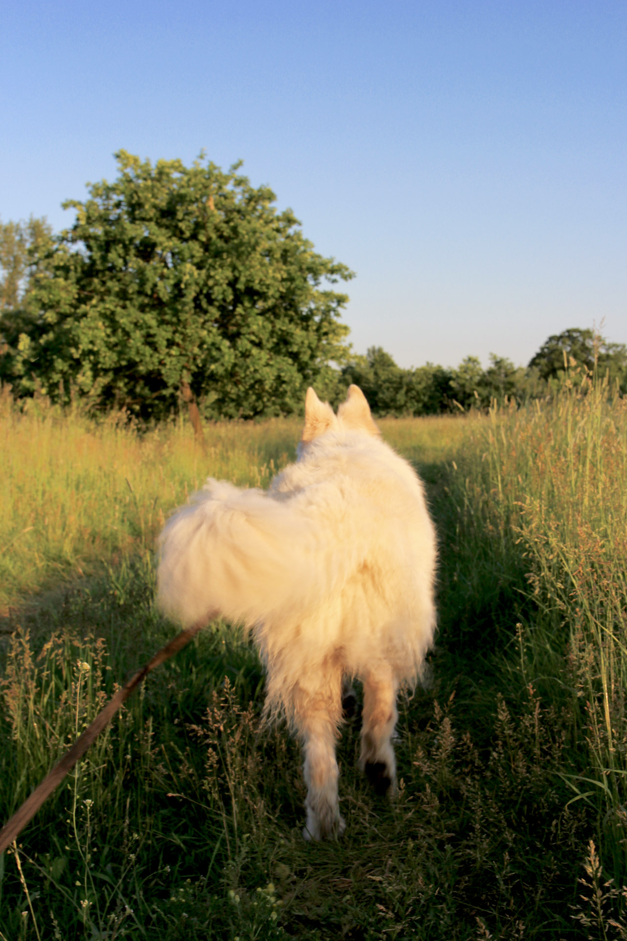Zdecydowanie mniej ludzi jest w tych miejsach, gdzie trawa jest wysoka. Miejscami jest ona poprzecinana wydeptanymi ścieżkami, po których i my się poruszamy. To dobry moment, żeby dać psu nieco wolnej łapy, trochę go wysuszyć, zrzucić jeszcze odrobinę energii.