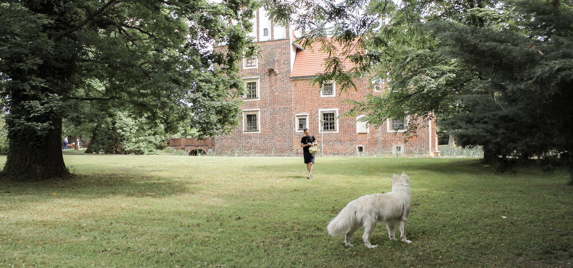W przyległym do zamku parku znajdziemy ładnie przystrzyżone trawniki, rozłożyste drzewa i niewielkie stawy z zaroślami. Nie dziwota, że spotkać tu można wiele fotografujących się młodych par. Heban podczas spaceru poruszał się więc przeważnie na lince...